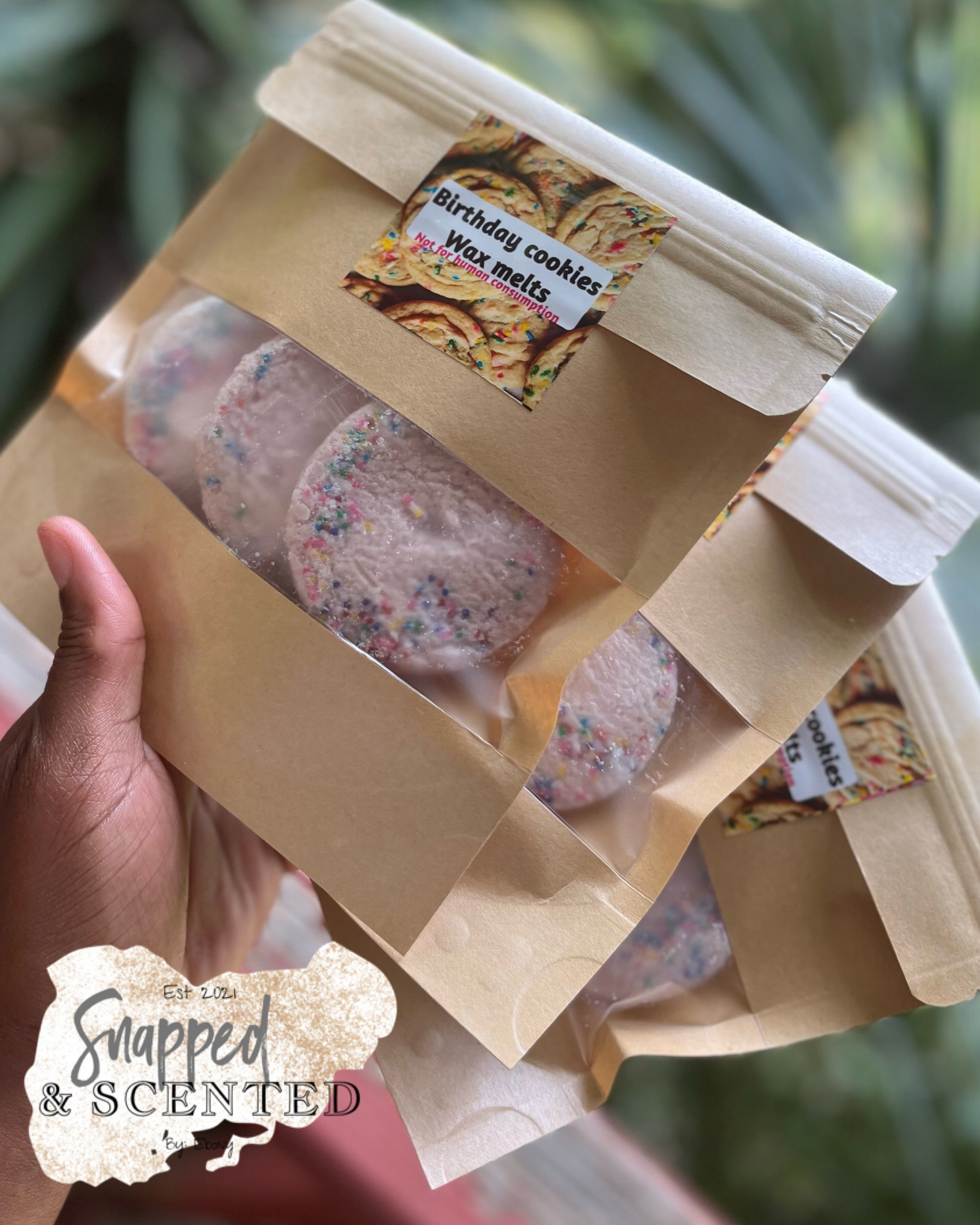 These wax melt cookies smell just like cake , in cookie form ✨ these cookies are made from 100% soy wax and you will receive 3 XL cookies in your package .